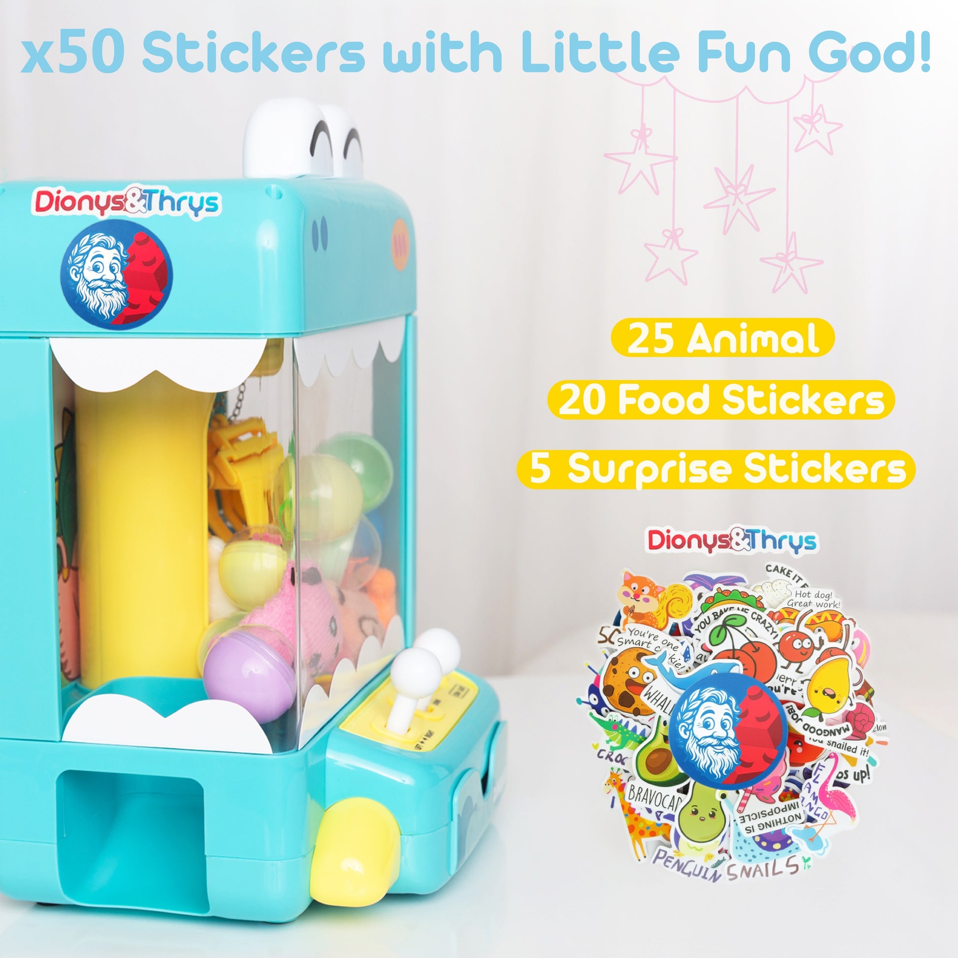 - SURPRISES INCLUDED: Packed with 10 Mini Plushies, 10 Mystery Eggs (Each with a Small Toy Inside), 20 Coins & 50 Animal & Food Sticker Pack! Also You Can Fill with Your Own Prizes: Refill It with Your Kids’ Favorite Treats: Candy, Treats, Snacks, Gum, Small Toys, Other Goodies